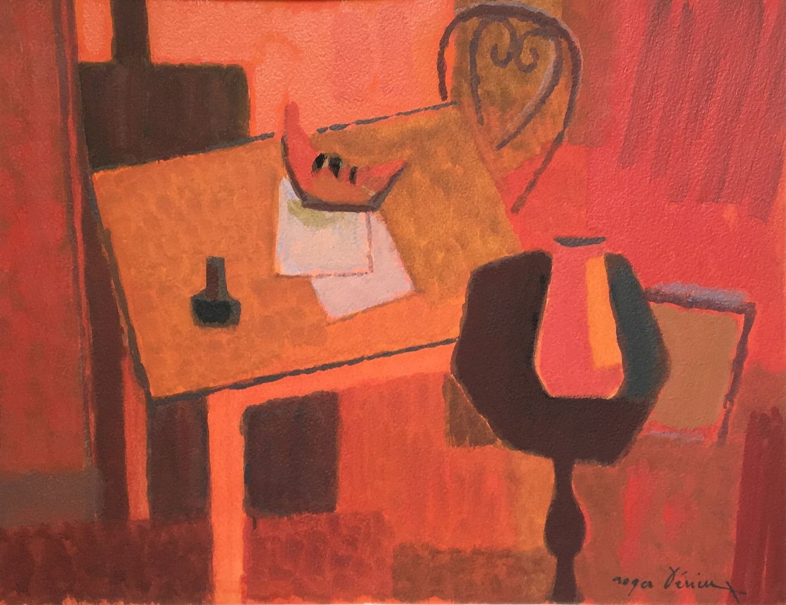 1946 Le 15 mai, rue Jacob, au Bar Vert (un des hauts lieux du Saint-Germain-des-Prés de l’époque) il rencontre deux sœurs, France et Reine Dautry. Amour immédiat et réciproque avec Reine, qui se poursuivra à l’automne dans une vie commune. Par Reine, il fera la connaissance d’André Frénaud et de Garbell puis, un peu plus tard, de Guy Weelen. En octobre, il quitte la rue du Bac pour le 14, rue de l’Université, où il disposera bientôt d’un petit atelier. Expose à nouveau au Salon des Moins de Trente Ans, où il côtoie Geneviève Asse, Baron-Renouard, Jacques Chantarel, Jean Cortot, Dmitrienko, Massagier, Truphémus.